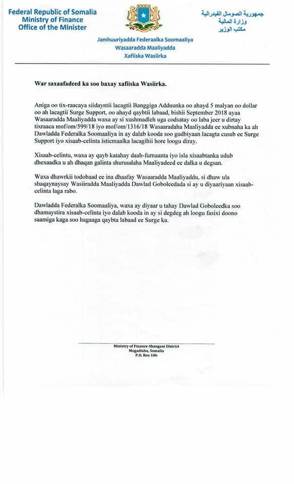 Wasiirka Maaliyadda ee Dowladda Faderaalka Cabdiramxaan Ducaalle Bayle ayaa bartiisa xiriirka bulshada soo dhigay qoraal uu ku dalbanayo in xisaab celin lasoo sameeyo lacagaha madaxda dowlad goboleedyada ay dowladda siisay.