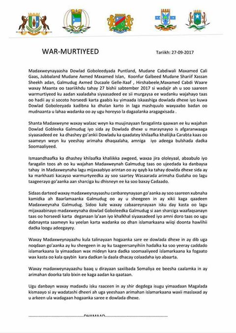 Madaxweynayaasha Warsaxafadeedka Soo saaray waxaa kamid ahaa madaxweynaha dowladda Puntland Cabdiweli Maxamed Cali Gaas, madaxweynaha Jubbaland Axmed Maxamed Islaam, madaxweynaha KG Shariif Sheekh Aadan, madaxweynaha Galmudug iyo kan Hirshabeelle.