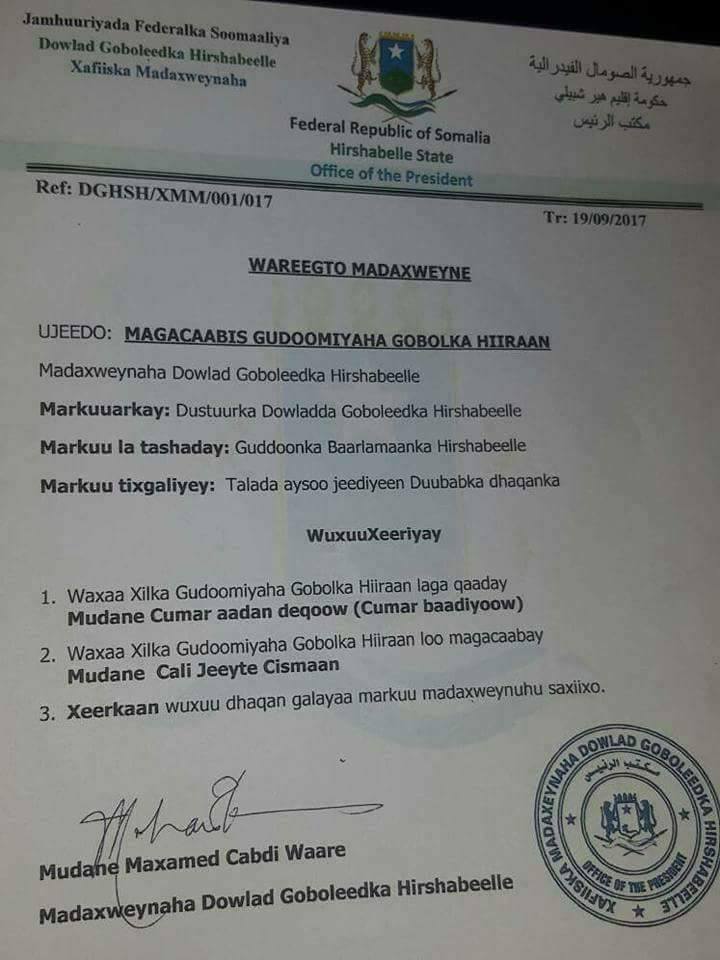Wareegto uu ku saxiixan yahay Madaxweyne Waare ayaa lagu sheegay in xilka qaadista loo maray dastuurka Hirshabeelle,la tashiga Guddoomiyaha Baarlamaanka Hirshabeelle iyo talo soo jeedinta Odayaasha Dhaqanka.