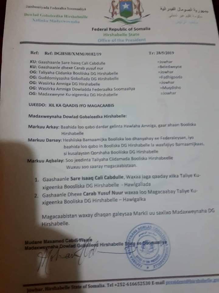 Madaxweynaha Hirshabeelle Maxamed Cabdi Waare ayaa gaashaandhe dhexe Carab Yuusuf Nuur u magacaabay taliye ku xigeenka ciidanka booliiska Hirshabeelle.