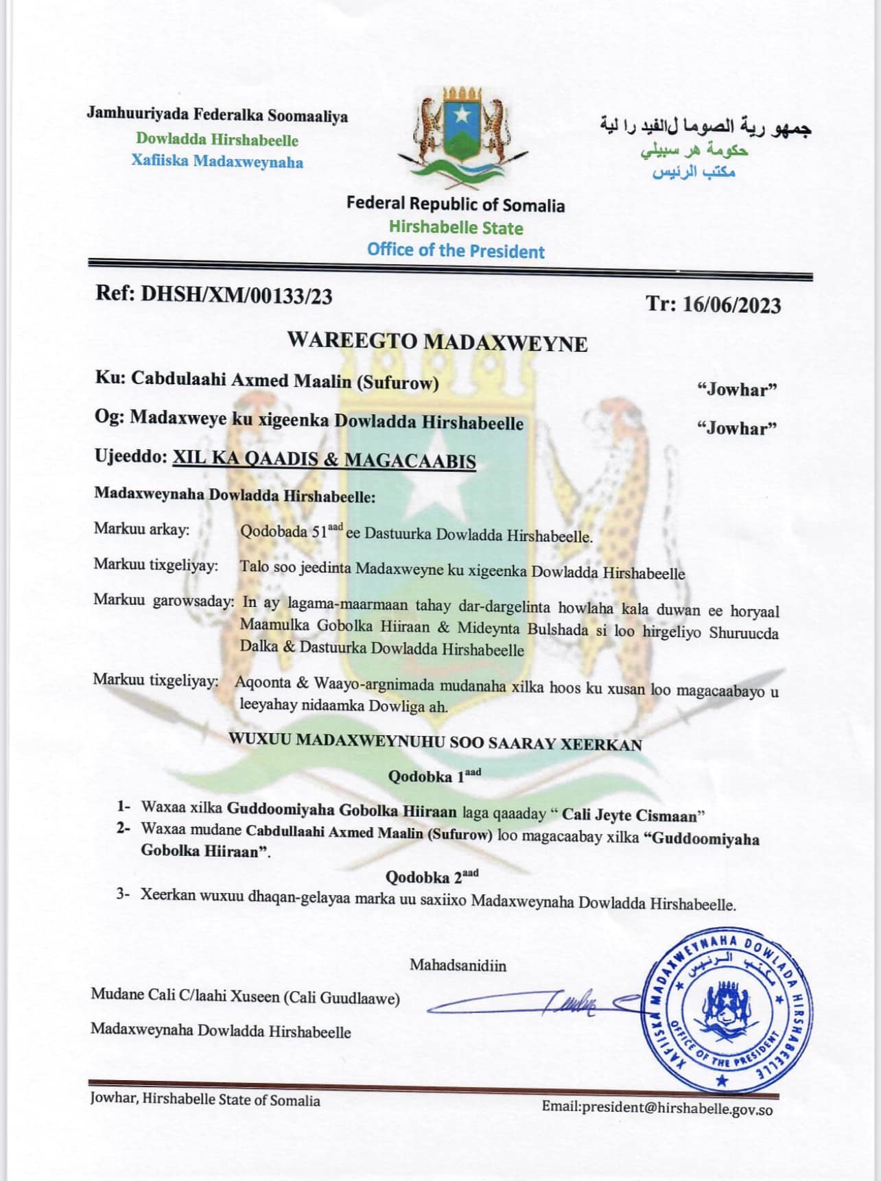 Madaxweynaha Hirshabeelle Cali Guudlaawe Xuseen ayaa Xilkii ka qaaday Gudoomiyihii Gobolka Hiiraan Mudane Cali Jeyte Cismaan, Isagoo Xilkaas u Magacaabay Mudane Cabdullaahi Axmed Maalin (Sufurow)