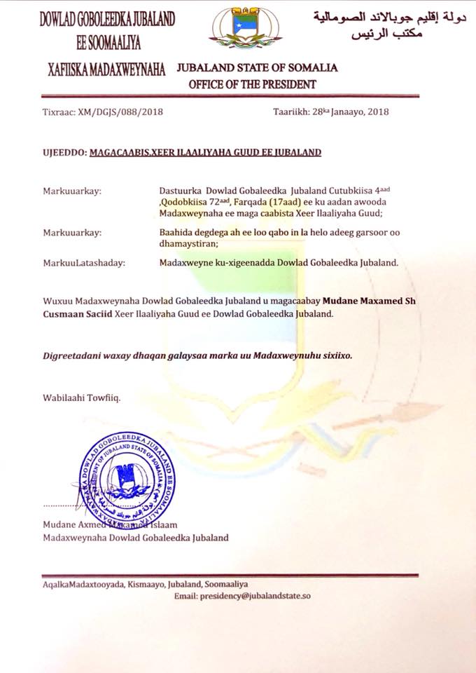 Madaxweynaha Maamulka Jubaland Axmed Maxamed Madoobe ayaa magacaabay Guddoomiyaha Maxkamadda sare ee Maamulkiisa.