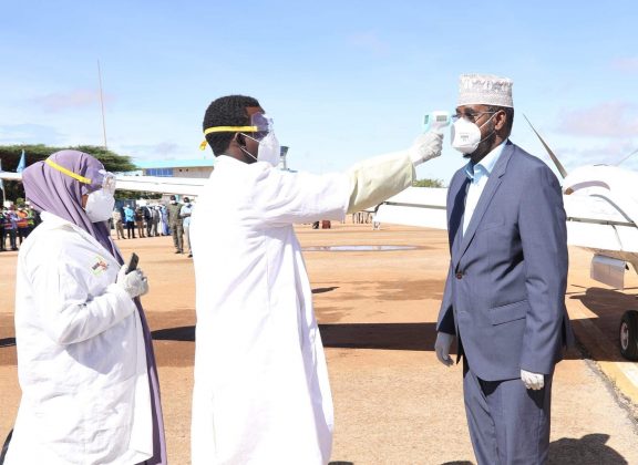 Iyadoo la ilaalinayo badqabka Bulshada waxaa Madaxweynaha iyo xubnaha kale ee safarka ku wehelinayay ay mareen baaritaan Caafimaad, iyadoo Madaxweyne Axmed Madoobe uu xariga ka jaray qaybo Cusub oo lagu kordhiyay garoonka Diyaaradaha Kismaayo ee Sayid Maxamed Cabdille Xasan.