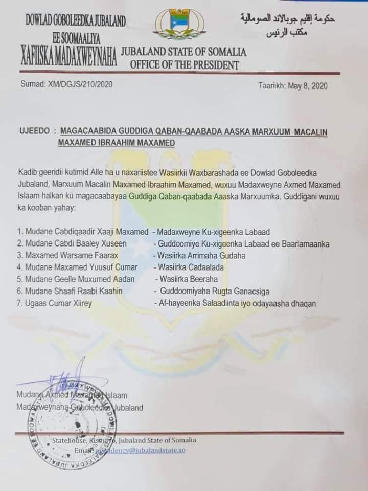 Madaxwaynaha Dowlad Goboleedka Jubbaland Axmed Maxamed Islaam ayaa Maanta Magacaabay Guddiga qaban-qaabada aaska Wasiirkii Wasaaradda Waxbarashada iyo Tacliinta Sare ee Jubbaland ee dhawaan ku geeriyooday dalka Hindiya.
