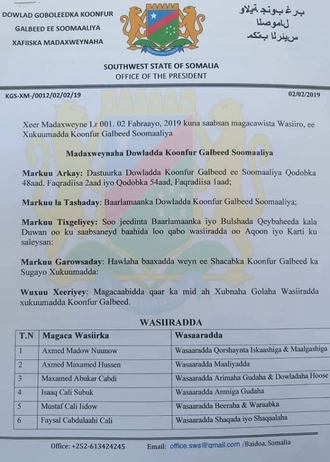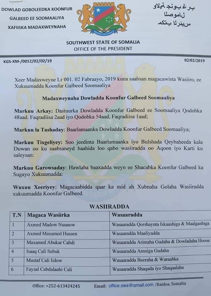 Wareegto uu soo saaray Madaxweynaha Koofur Galbeed ayaa 10-ka Wasiir uu magacaabay ayaa waxaa ku jira wejiyo cusub ah.