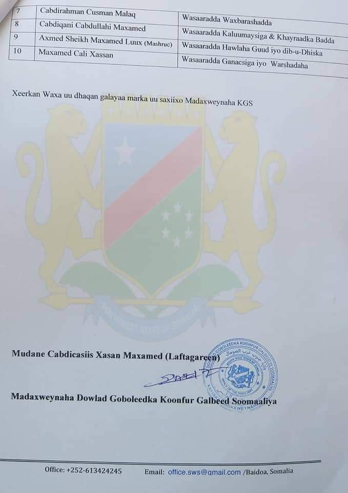 Madaxweynaha Koofur Galbeed C/casiis Xasan Maxamed (Lafta Gareen) ayaa magacaabay Gole Wasiiro ka kooban 10 Wasiir.