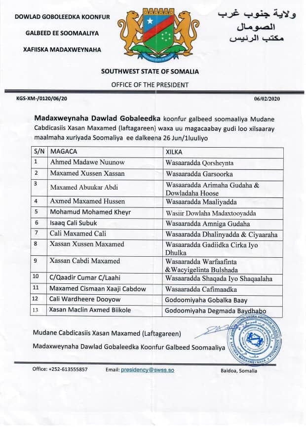 Madaxweynaha Dowlad Goboleedka Koofur Galbeed Cabdicasiis Xasan Maxamed (Lafta gareen) ayaa Magacaabay Guddi loo xilsaray maalmaha xuriyada Soomaaliya ee Dalkeena 26 jun/1luulyo.