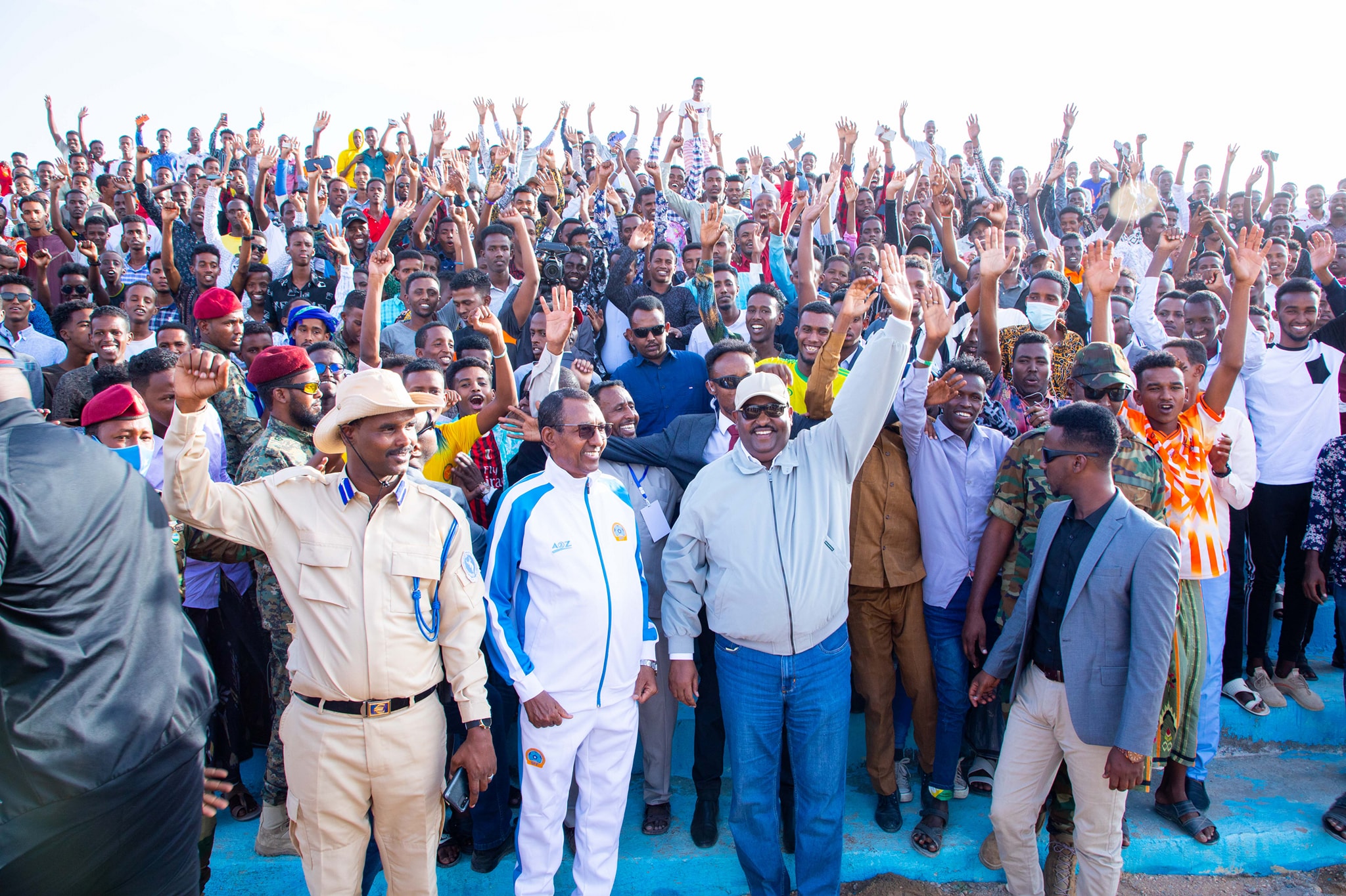 Madaxweynaha ayaa bogaadiyay shaqada wanaagsan ee ay qabteen guddigii dhismaha garoonka Mire Awaare wuxuuna guddoonsiiyay Abaalmarin, isagoo ku dhawaaqay in uu bilowday wejiga labaad ee dhismaha garoonka . Sidoo kale wuxuu Madaxweynuhu dhiirrigeliyay kooxaha ka qeybgalaya tartanka horyaalka kubadda cagta ee Puntland.