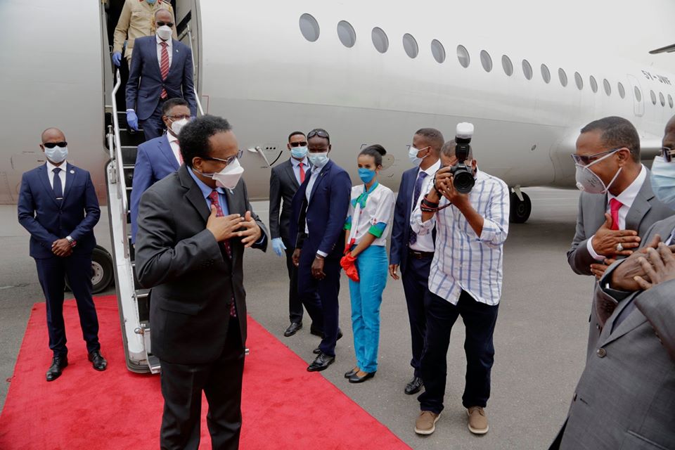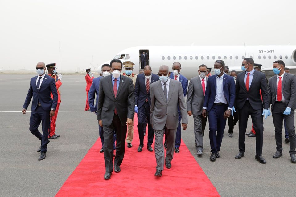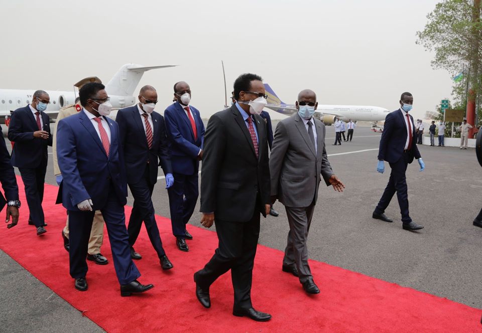 Madaxweynaha Jamhuuriyadda Federaalka Soomaaliya Mudane Maxamed Cabdullaahi Farmaajo iyo wafdi uu hoggaaminayo oo ay ka mid yihiin Ra’iisul Wasaaraha XFS Mudane Xasan Cali Khayre, Guddoomiyaha Golaha Shacabka Mudane Maxamed Mursal Sheekh, Wasiirka Arrimaha Gudaha Mudane Cabdi Maxamed Sabriye, Wasiirka Batroolka iyo Macdanta Mudane Cabdirashid Maxamed Axmed iyo masuuliyiin kale ayaa si diirran loogu soo dhaweeyey Caasimadda dalka aan walaalaha nahay ee Jamhuuriyadda Jabuuti.