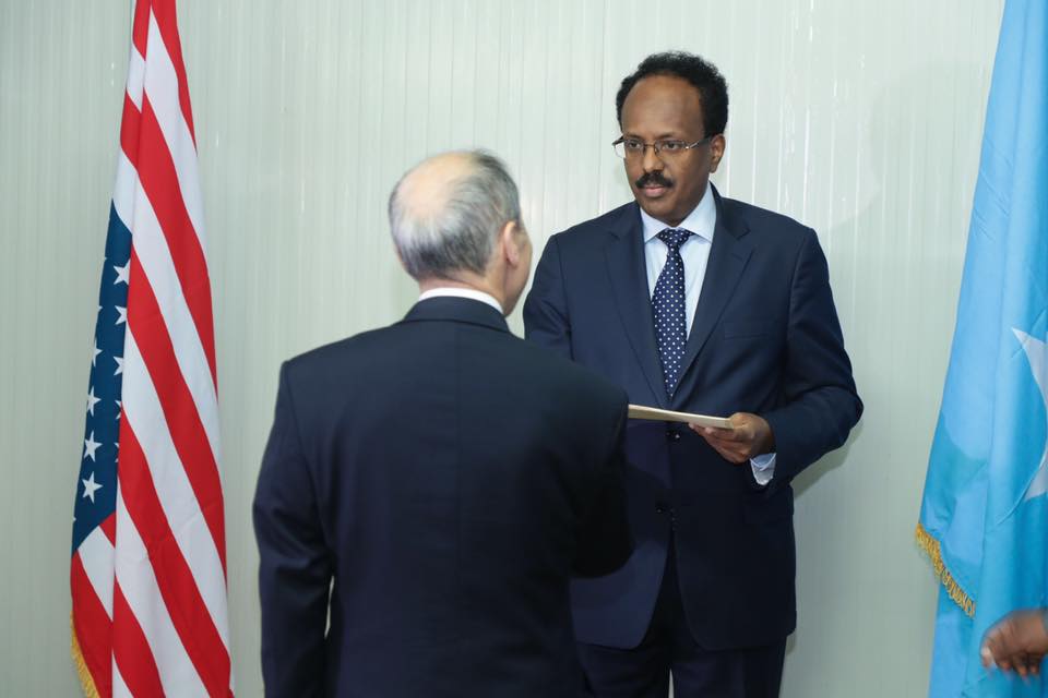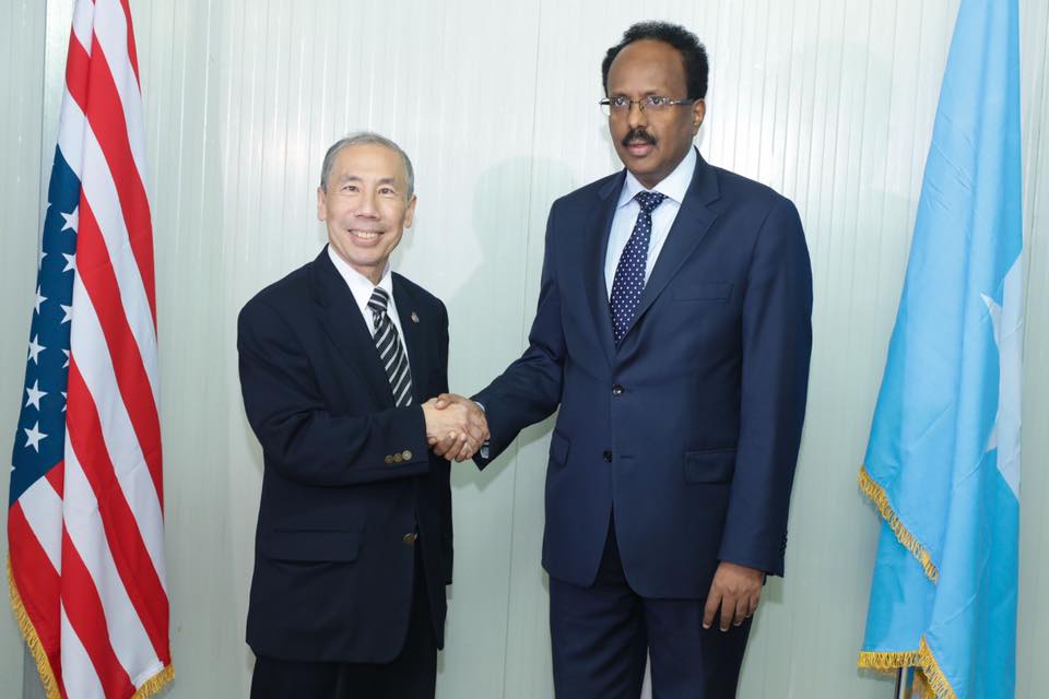 Madaxweynaha Jamhuuriyadda Federaalka Soomaaliya Mudane Maxamed Cabdullaahi Farmaajo ayaa maanta warqadaha aqoonsiga ka guddoomay danjiraha cusub ee Dowladda Mareykanka ay usoo magacawday Soomaaliya Mudane Donald Yukio Yamamoto.