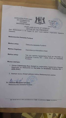 Madaxweynaha dowladda Puntland Cabdiweli Maxamed ayaa wareegto ka soo baxday xafiiskiisa Cabdirisaaq Nuur Halac oo horay u soo haysan jirey xafiiska dhalinyarada gobolka Nugaal u magacaabay agaasimaha waaxda maaliyadda hayadda AIDS-ka Puntland