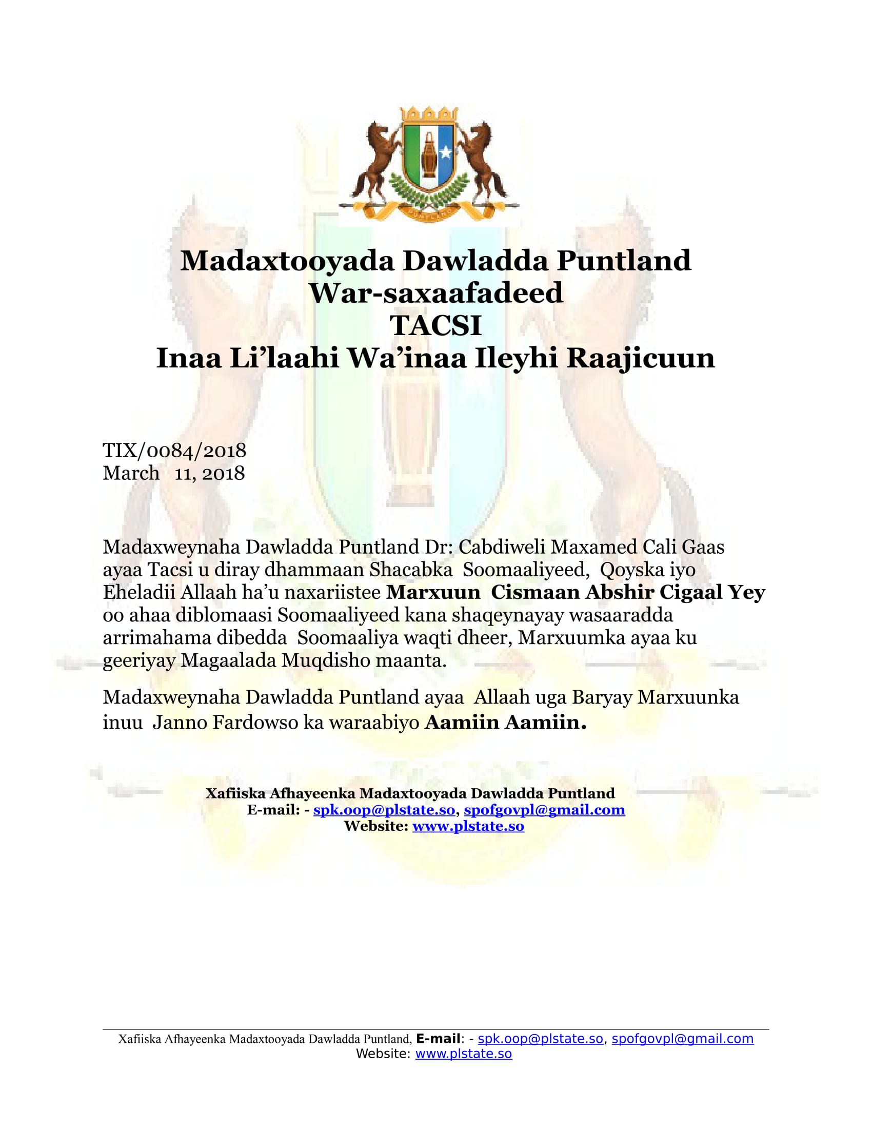Madaxweyne Gaas oo Tacsi u diray qoyska Dublumaasi ku geetiyooday Muqdisho
