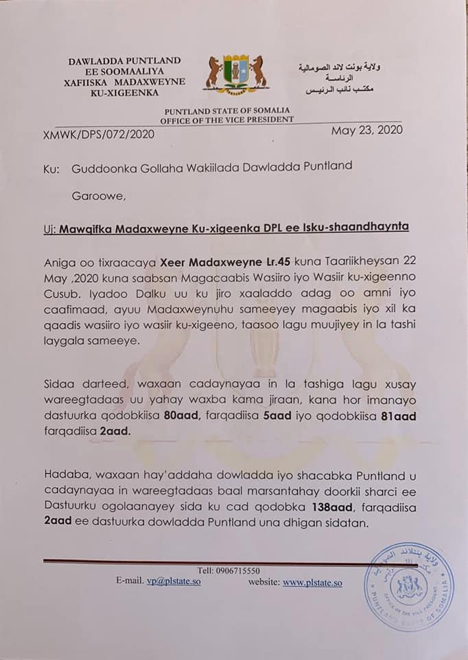 Madaxweyne ku xigeenka Puntland ayaa qoraalka ku beeniyay in lagala tashaday magacaabida wasiirada iyo wasiir ku xigeenada cusub ee uu Madaxweynuhu magacaabay.