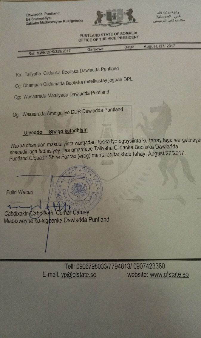 Warqad qoraal ah oo ka soo baxday xafiiska madaxweyne ku-xigeenka ahna ku-simaha madaxweynaha dowladda Puntland Eng Cabdixakiin Cabdullaahi Cumar Camey ayaa shaqadii looga joojiyey taliyaha ciidanka Booliska Puntland Cabdulqaadir Shire Faarax (Ereg).