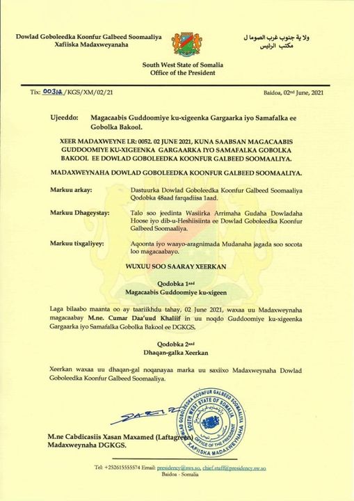 Wareegto kasoo baxday Xafiiska Madaxweynaha Koonfur Galbeed ayaa waxaa lagu sheegay kadib markii uu dhageystay talo soo jeedinta Wasiirka Arrimaha Gudaha uu Mas’uulkas Magacaabay.