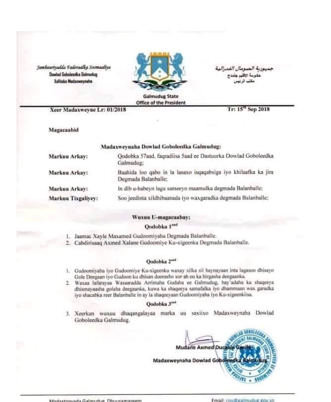 Wareegto ka soo baxday Xafiiska Madaxweynaha Maamulka Galmudug Axmed Ducaale Geelle Xaaf ayaa waxa uu Maamul Cusub ugu sameeyey degmada Balanbale ee Gobolka Galgaduud.