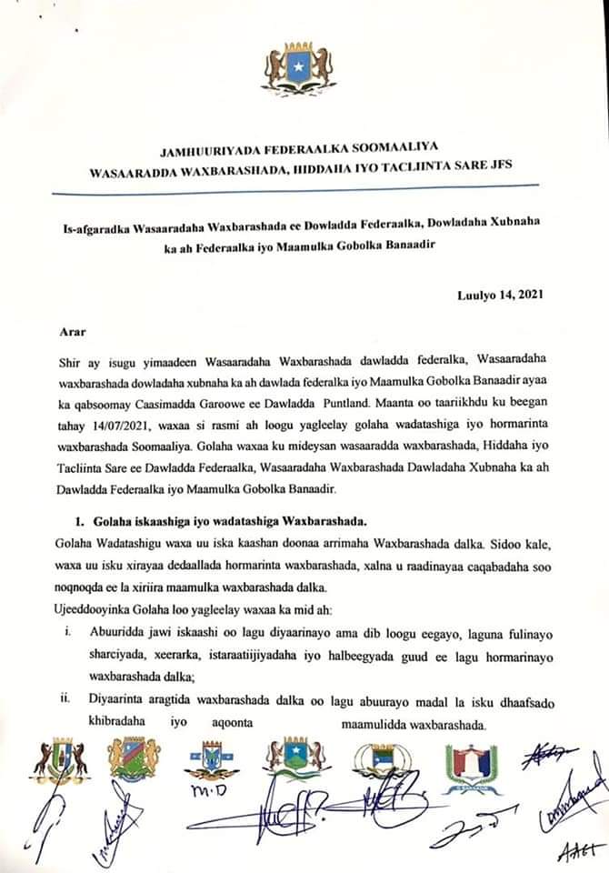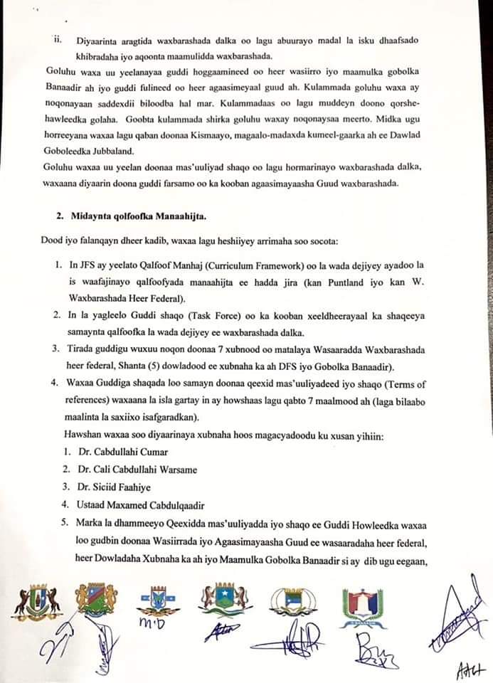 Shir muddo dhawr bari ah uga socday Wasaaradaha Waxbarashada Garoowe ayna hogaaminayaan Wasiirada Waxbarashada ayaa waxaa la isku afgartay qodobadaan hoos ku xusan