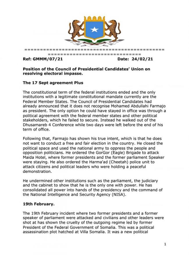 In Madaxweynihii hore Maxamed C/llaahi Farmaajo inuu ku wareejiyaa talada Gole Qaran oo Kumeel Gaara ah, In heshiis kama-dambeys ah laga gaaro saddexda qodob ee muranku ka taagnaa ee hore u jiray qaab dhismeedka hay’adaha maamulka doorashooyinka, Arrinta Somaliland iyo Arrinta Gobolka Gedo, in Golaha Musharaxiinta Madaxweynaha inay si toos ah uga qeybqaataan wadahadalada doorashooyinka iyo wadatashiga in la abuuro jawi siyaasadeed, oo ay ku jirto xorriyadda banaanbaxa, qabashada shirarka, ololaha, dhaq dhaqaaqa xorriyadda hadalka iyo u adeegsiga warbaahinta qaranka si siman.