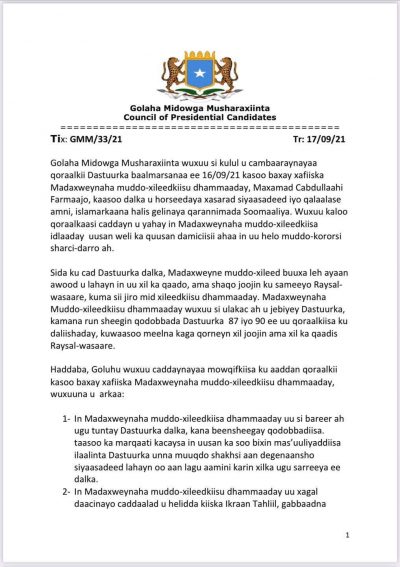 3- In Madaxweynaha muddo-xileedkiisu dhammaaday loo aqoonsado isaga iyo la taliyayaashiisa qaswadeyaal liddi ku ah xasilloonida dalka.