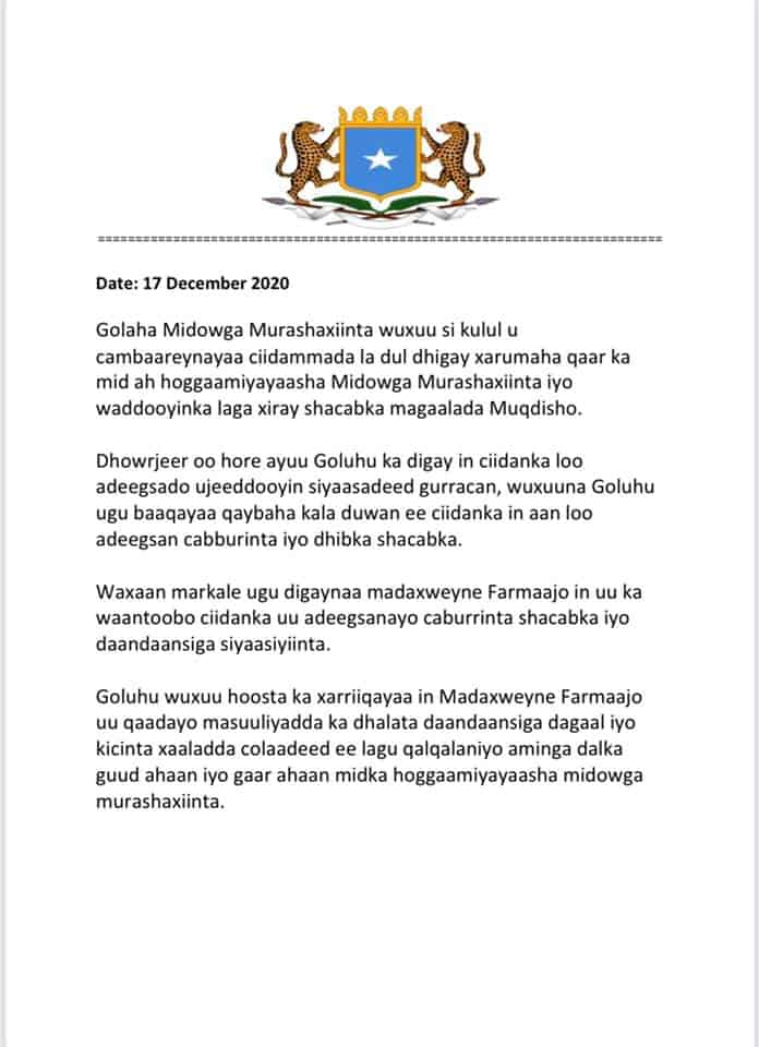 Xubnaha Midowga Musharixiinta Madaxweynaha Soomaaliya ayaa waxaa ay qoraal deg deg ah kasoo saareen xaalada Maanta ee Magaalada Muqdisho iyo Ciidamo ay sheegeen in la dul-dhigay Xarumaha qaar ee Musharixiinta.