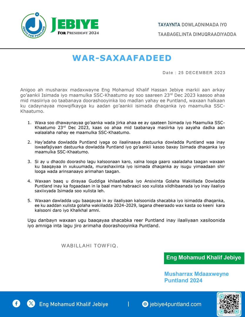 Musharax Maxamuud Khaliif Jebiye “Waxaan soo dhoweynayaa go’aankii Isimada SSC, Waana in la isu yimaado si looga tashado arimaha taagan,”