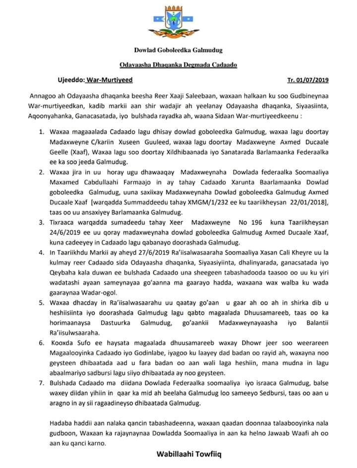 kadib Kulan Magaaladda Cadaado ee Xarunta Maamulka Galmudug ku yeesheen waxgaradka Magaaladdas ayaa maanta waxay ka soo sareen warmurtiyeed ay uga hadlayaan Xaaladda Galmudug.