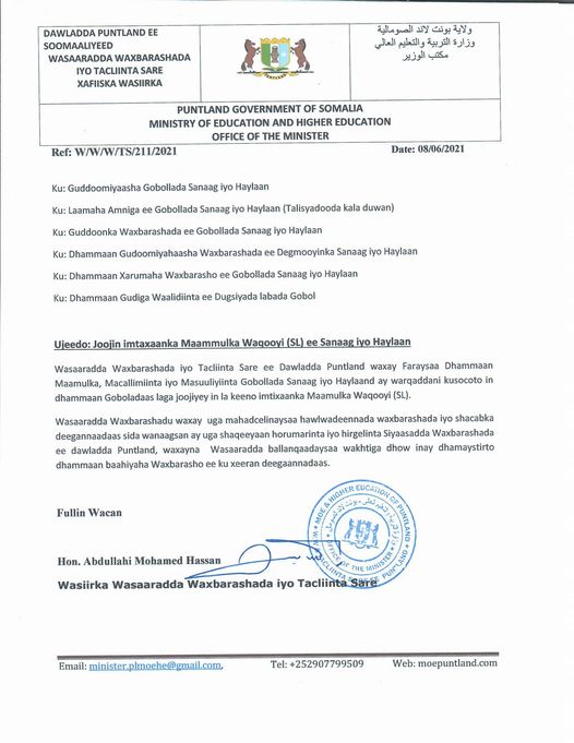 Wasaaradda Waxbarashada iyo Tacliinta sare ee dowlad Goboleedka Puntland, ayaa shaacisay inay joojineyso qorsho Soomaaliland ay ku dooneyso in Imtixaanaadka Iskuulada uga sameeyso Gobollada Sanaag iyo Haylaan.