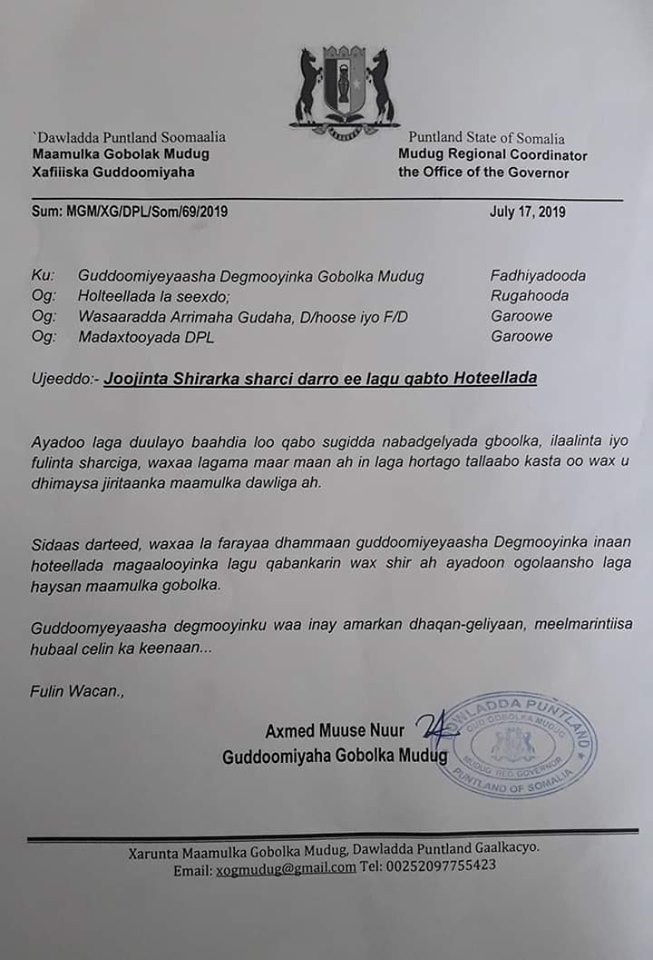 Wareegto ka soo baxday Xafiiska Guddoomiyaha Gobolka Mudug ee Puntland Axmed Muuse Nuur taas oo ku socota Milkiilayaasha Hotelada ku yaalla degmooyinka Gobolka Mudug ayaa laga maamnuucay in hoteeladooda lagu qabto shirar aysan ogayn dowladda Puntland.