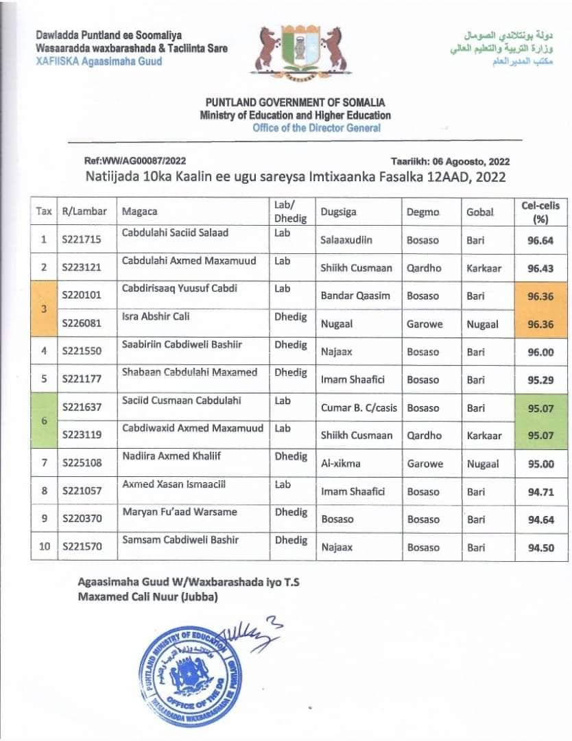 Puntland oo shaacisay 10 Arday ee Kaalimaha ugu sareeya ka galay imtaxanadka fasalka 4-aad