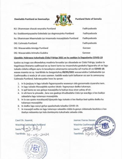 Kulan ay ku yeesheen magaalada Garoowe Wasiirada Cadaalada iyo Caafimaadka ayaa waxa ay si wadajir ah usoo saareen habraaca tukashada salaada Ciidulfidriga ee maalinta Qamiista ah.