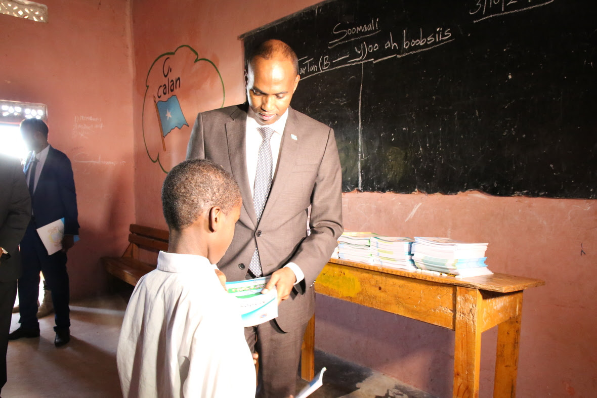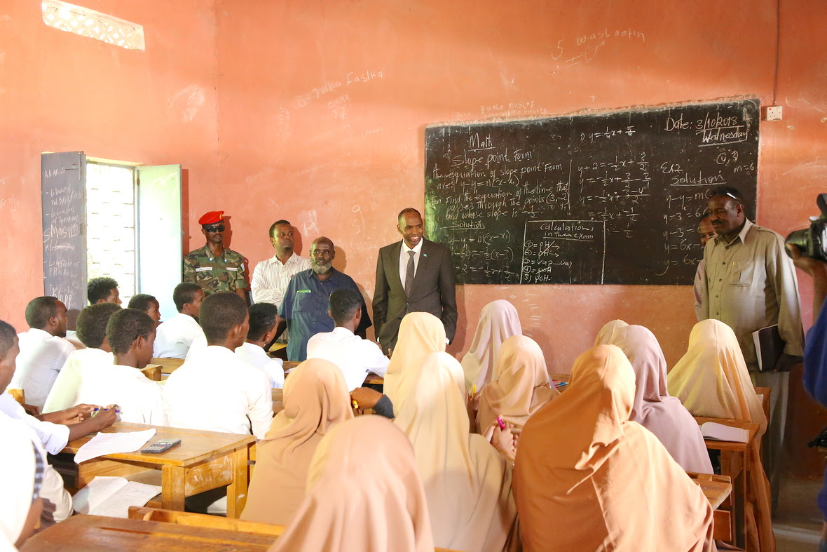 Ra’iisul Wasaare Xasan Cali Khayre oo uu wehliyo wasiiru dawlaha waxbarashada iyo tacliinta sare, ayaa mid mid u galay fasallada iskuulka oo ay ka socotay qaybinta buugaagta manhajka ay dhawaan dawladdu daah-furtay, waxa uuna xog-waraystay maamulka iyo macallimiinta iskuulka.