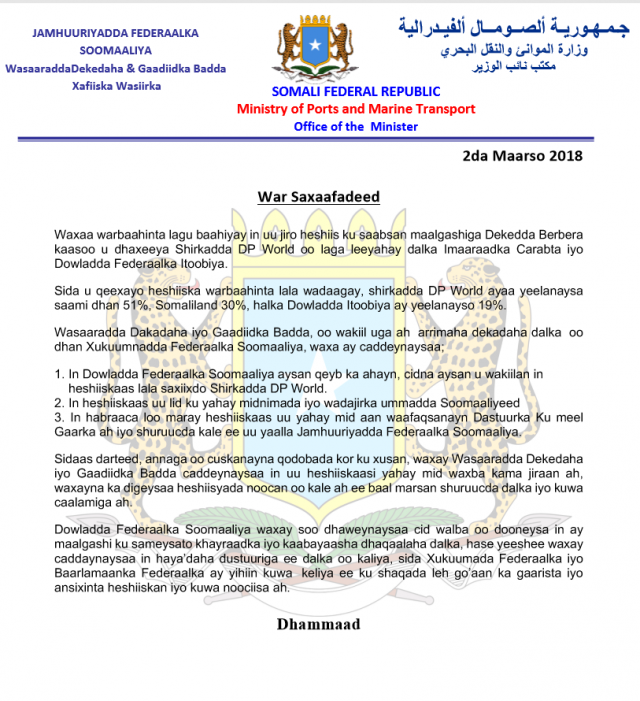War saxaafadeed maanta ka soo baxay Wasaaradda Dekedaha iyo Gaadiidka Badda ee DFS ayaa lagu caddeeyey in dowladdu aysan aqoonsanayn heshiiskii dhexmaray shirkadda DP World ee UAE, Dowladda Itoobiya iyo Somaliland. Heshiiskan oo ay shalay shaacisay DP World ayaa qoraya in shirkadda DP World ee maamulaysa Dekeda Berbera ay leedahay saami dhan 51%, Somaliland ayana ay yeelatay 30%, meesha Itoobiya ay leedahay 19%.