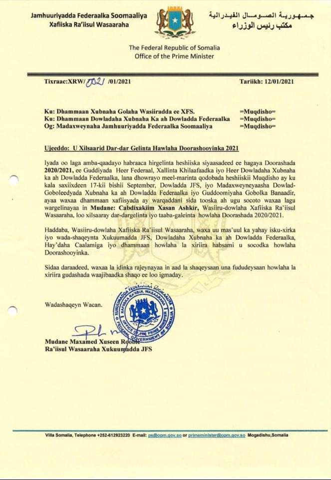 Ra’iisul Wasaaraha Soomaaliya Maxamed Xuseen Rooble ayaa Wasiiru Dowlaha Xafiiska Ra’iisul Wasaaraha C/xakiim Xasan Ashkir u xil saaray dardar gelinta howlaha doorashooyinka.