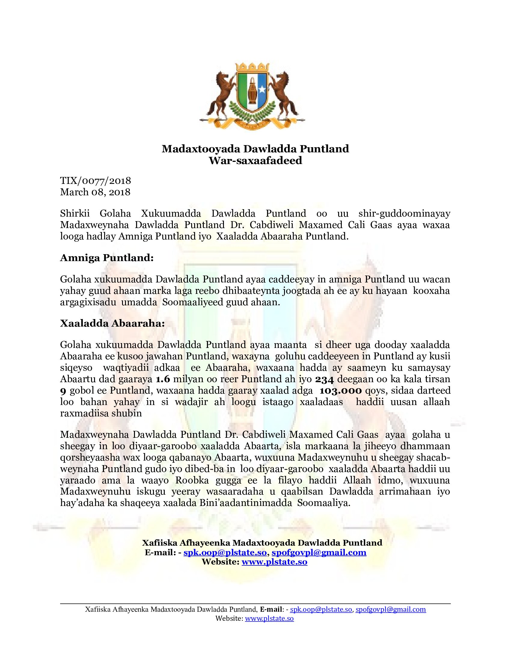 Shirkii Golaha Xukuumadda Dawladda Puntland oo uu shir-guddoominayay Madaxweynaha Dawladda Puntland Dr. Cabdiweli Maxamed Cali Gaas ayaa waxaa looga hadlay Amniga Puntland iyo Xaaladda Abaaraha Deeganada Puntland.