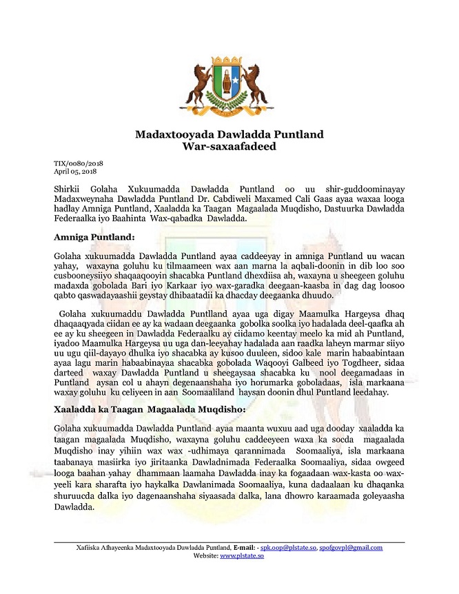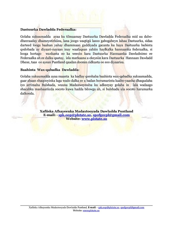Shirkii Golaha Xukuumadda Dawladda Puntland oo uu shir-guddoominayay Madaxweynaha Dawladda Puntland Dr. Cabdiweli Maxamed Cali Gaas ayaa waxaa looga hadlay Amniga Puntland, Xaaladda ka Taagan Magaalada Muqdisho, Dastuurka Dawladda Federaalka iyo Baahinta Wax-qabadka Dawladda.