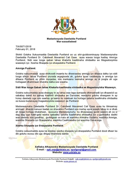 Shirkii Golaha Xukuumadda Dawladda Puntland oo uu shir-guddoominayay Madaxweynaha Dawladda Puntland Dr. Cabdiweli Maxamed Cali Gaas ayaa waxaa maanta looga hadlay Amniga Puntland, Sidii wax looga qaban lahaa khatarta kaallimaha shidaalka ee Magaalooyinka waaweyn iyo Xeerka Shaqada iyo shaqaalaha Puntland. Amniga Puntland.