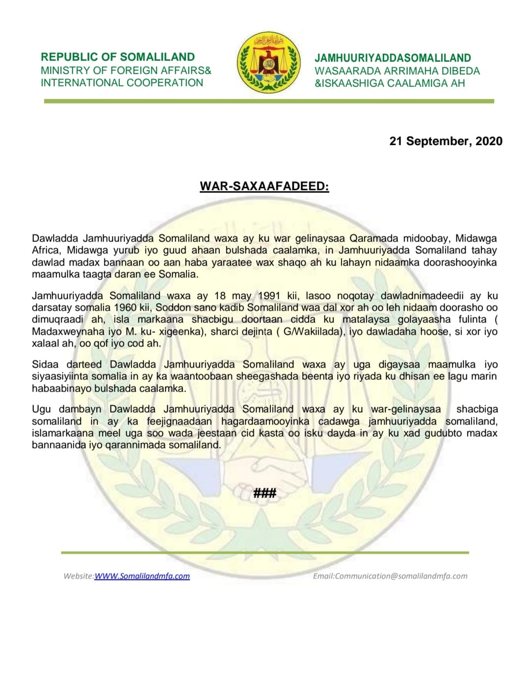 Somaliland ayaa warkasoo saartay Shirkii dhawaan lagu soo gaba-gabeeyay Muqdisho, waxaana ay baaq u dirtay Beesha Caalamka.