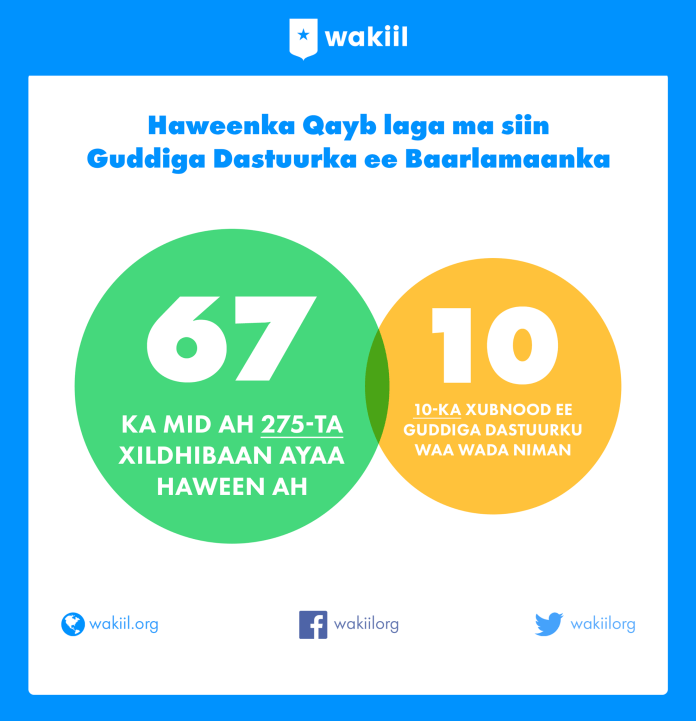 67 ka mid ah 275-ta xildhibaan ee baarlamaanku waa haween haddana laga ma qayb gelin guddiga dastuurka oo la oran karo waa kan ugu muhiimsan guddiyada baarlamaanka.