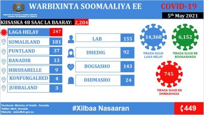 Guud ahaan Cudurka safmareenka ah ee COVID-19 ayaa waxaa Soomaaliya laga diiwaangeliyay 14,368, xaaladood 745 dhimasho ah, halka ay ka bogsadeen 6,152, kuwaas oo ku sugan Magaalada Muqdisho & Gobolada dalka.