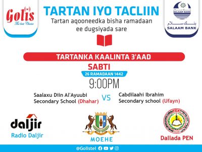 Labada Iskuul ee xalay ku haray Wareega Afar dhamaadka (Semi-final) ayaa caawa isku arkaya Tartanka loogu beretamayo Kaalinta 3’aad ee Barnaamijka Tartan iyo Tacliin.