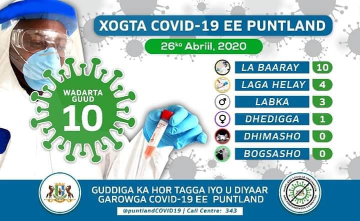 Puntland tirada dadka laga helay fayraska “Corona” ayaa maanta gaartay 10 ruux, kaddib markii goor dhawayd la xaqiijiyay 4 xaaladood oo cusub.
