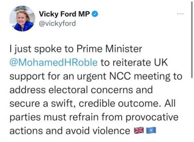 Vicky Fod oo ah Wasiirka Afrika UK ahna xildhibaan ka tirsan Baarlamaanka UK ayaa sheegtay in ay la hadashay Ra’iisul Wasaaraha Soomaliya markalana ay ku celisay Sida ay UK u taageersantahay shirka Degdeg ah ee arimaha doorashada.