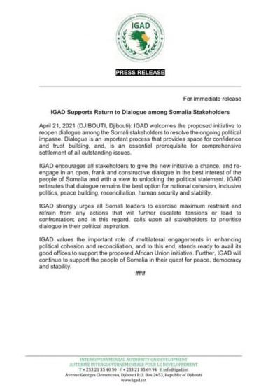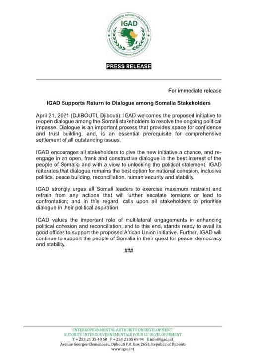 Qoraal kasoo baxay Urur Goboleedka IGAD ayaa waxaa lagu sheegay inay muhiim taha in dib loo bilaabo wada-hadallada arrimaha doorashooyinka, isla markaana daneeyayaasha Siyaasadda fursad ay isa siiyan.