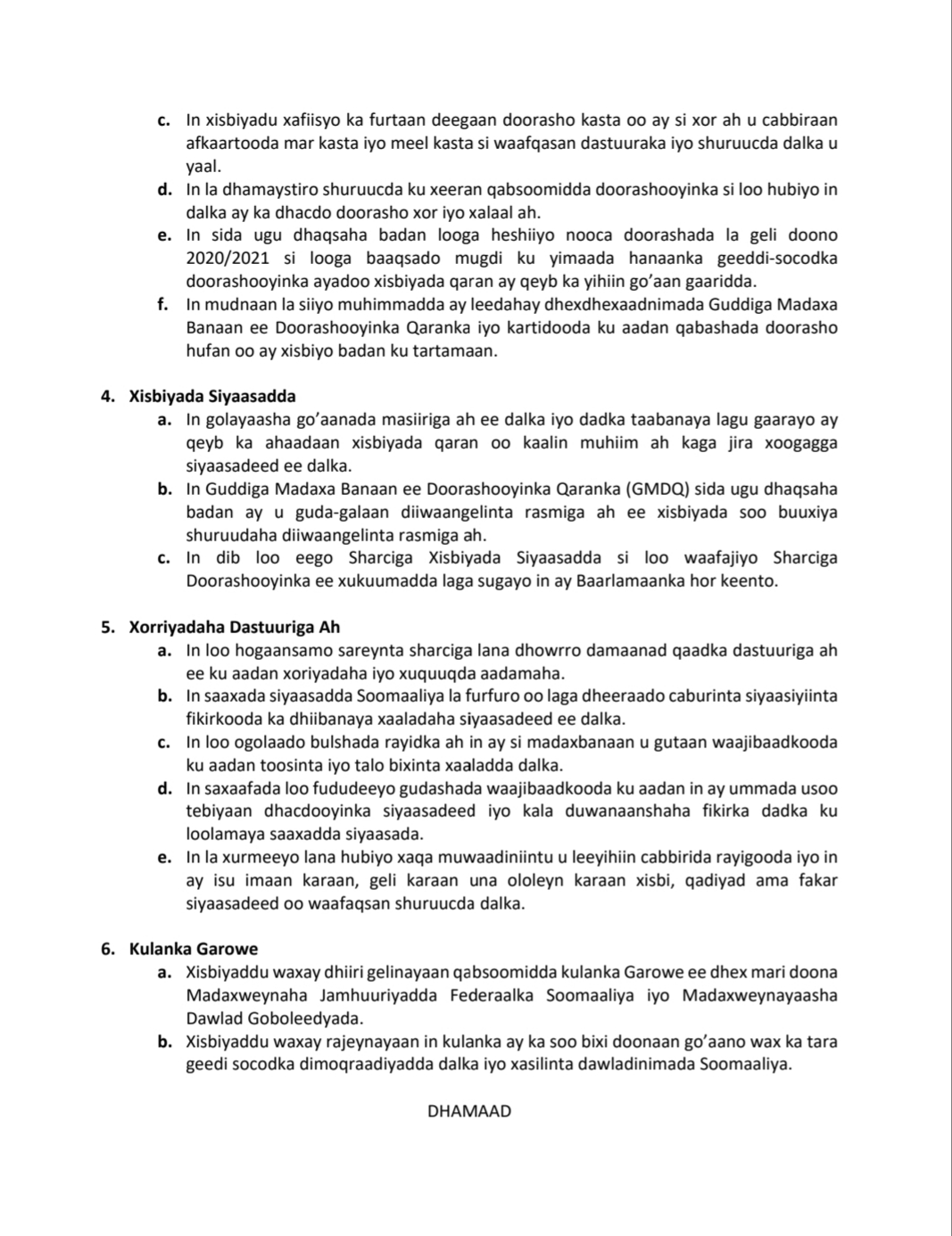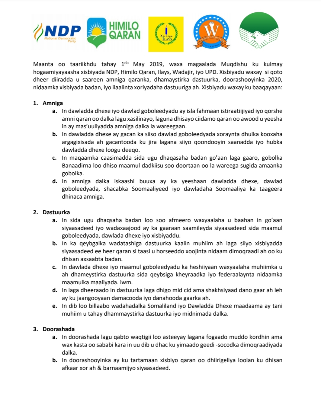 Urur siyaasadeedyadan ayaa kala ahaa Himilo Qaran, Wadajir, UPD, Ilays iyo NDP, waxaana ay ku baaqeen doorashada dalka in lagu qabto waqtigii loogu talagalay oo aanay dhicin muddo kordhin.