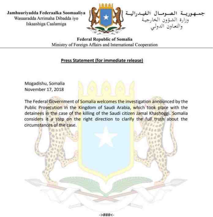 “Soomaaliya waxaa ay u aragtaa talaabo sax ah oo horay loo qaaday in xaqiiqda buuxda ee xaaladda kiiskan la xiriiro la cadeeyo” ayaa lagu yiri qoraalka wasaaradda arrimaha dibadda.