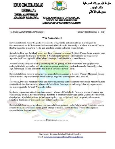 War saxaafadeed ka soo baxay Madaxtooyada Jubbaland ayaa lagu sheegay in Madaxweynaha muddo xileedkisu dhammaaday uu Shacabka Soomaaliyeed iyo dunidaba uu si buuxda ugu bidhaamiyay in shaqsi uu kala weyn yahay Qaranka Soomaaliyeed, dulmiga iyo cadaalad darada uu garab u yahay.