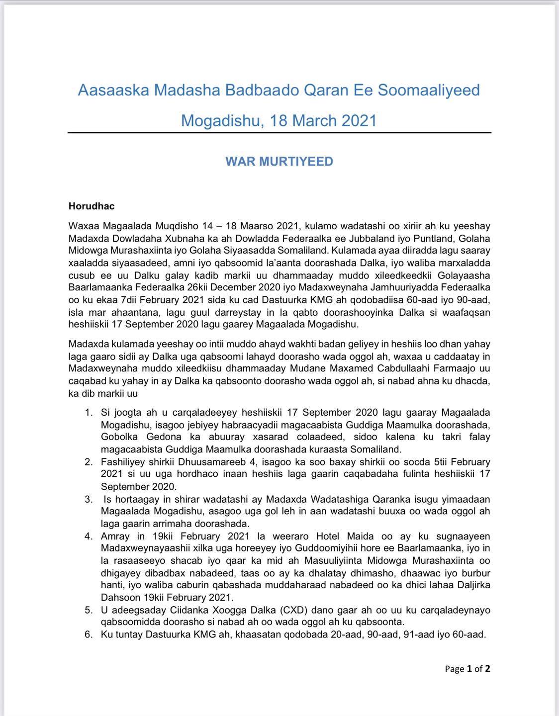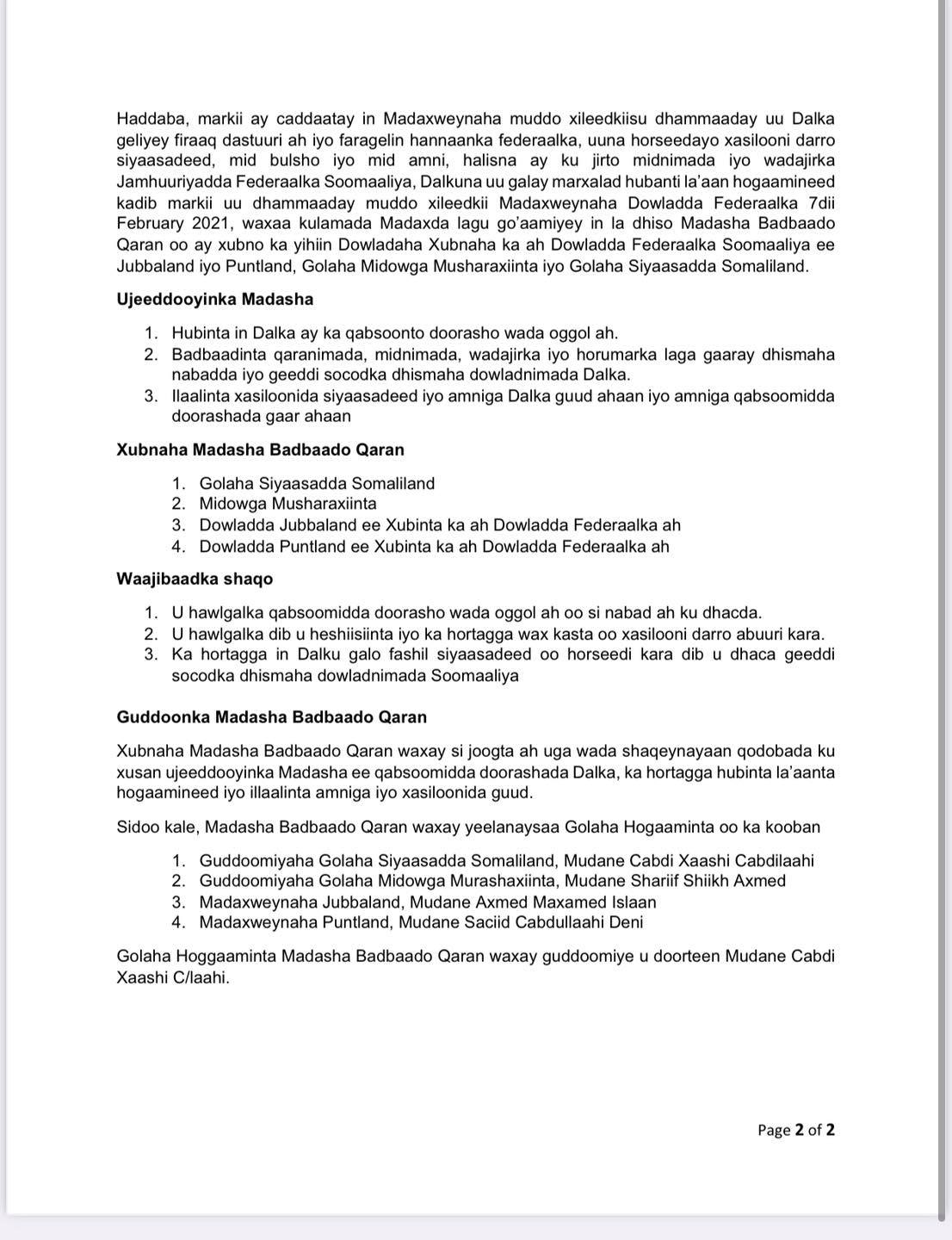 Golaha Badbaado Qaran ayaa goor dhow loogaga dhawaaqay magaalada Muqdisho. Wasiirka Arrimaha Gudaha Puntland Maxamed C/raxmaan Dhabancadde ayaa akhriyay War-Saxaafadeed ay ku mideysan yihiin Madaxweynayaasha Puntland, Jubbaland, Guddoomiyaha Aqalka Sare iyo Midowga Musharraxiinta.