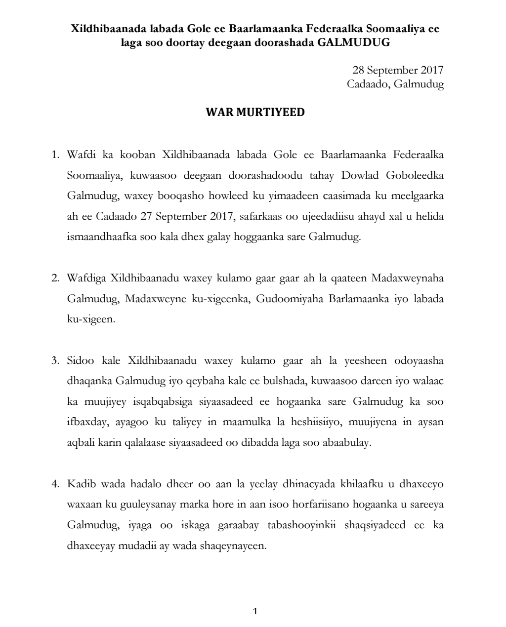 Xildhibaanada ayaa qoraalkooda ku muujiyay inay la kulmeen madaxwaynaha Galmudug Axmed Geelle Xaaf, kuxigeenkiisa Maxamed Carabay iyo guddoomiyaha baarlamaanka ee Galmudug Cali Gacal Casir, balse nasiib darro ay madaxda kalle ay diideen wadahadal in lagu dhameeyo khilaafka, madaxwaynaha xilka laga qaaday ee Xaafna uu ogolaaday wadahadal in lagu dhameeyo.