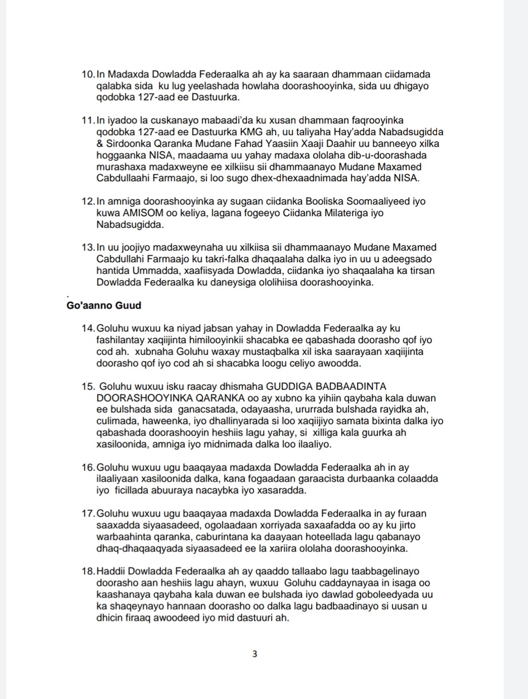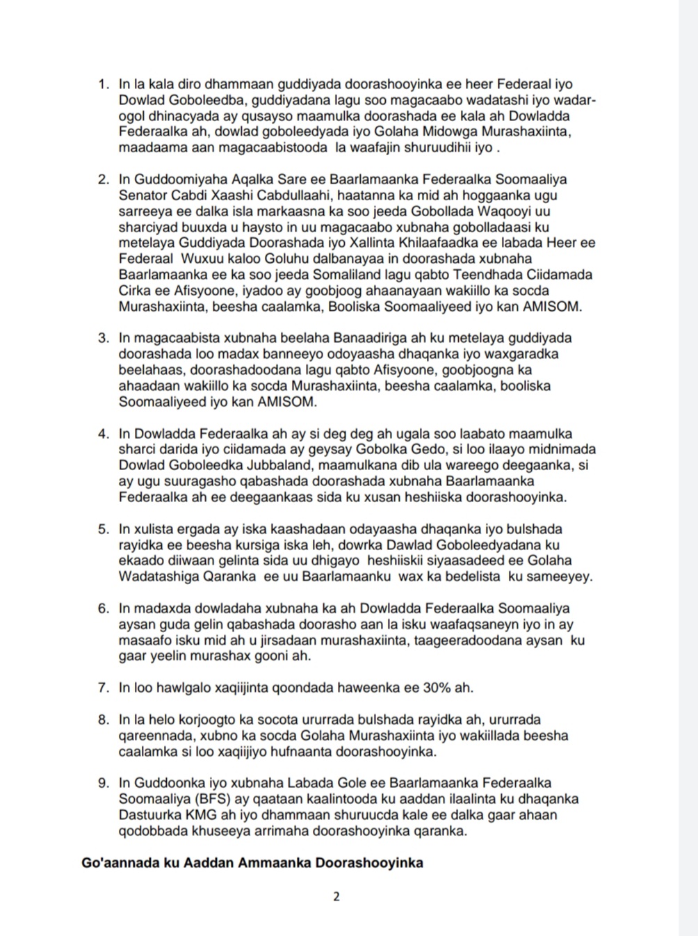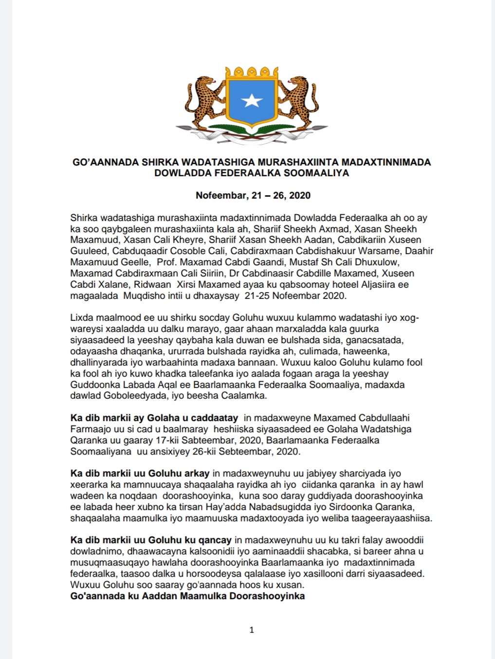 Midowga Musharaxiinta Madaxweynayaasha Soomaaliya ayaa goor dhow war murtiyeed ka kooban 18 qodob, kaddib shir u socday lix maalmood oo ay ku yeesheen Muqdisho.