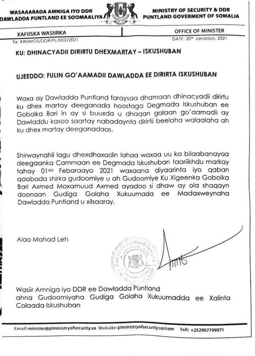 War qoraal ah oo maanta kasoo baxay xafiiska Wasiirka amiga Puntland Cabdisamad Galalan ayaa lagu sheegay in beelihii dhawaan ku dagaalamay degmada Iskushuban ee gobolka Bari ay dhaqan galiyaan go’aanadii lagu gaaray degmada taas oo lagu joojinayay colaadii labad dhinac.